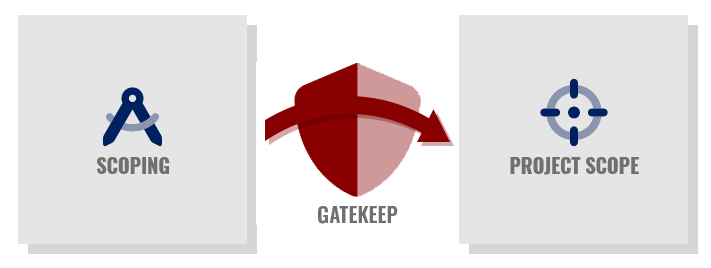 Gatekeeping ensures that scope items meet predefined criteria before being accepted. It uses a risk matrix and approval workflow to validate technical, safety, and budgetary aspects.